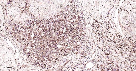 Paraformaldehyde-fixed, paraffin embedded Human Breast Cancer; Antigen retrieval by boiling in sodium citrate buffer (pH6.0) for 15 min; Antibody incubation Ferritin Heavy Chain Monoclonal Antibody, Unconjugated (bsm-54108R) at 1:200 overnight at 4°C, followed by conjugation to the bs-0295G-HRP and DAB (C-0010) staining.