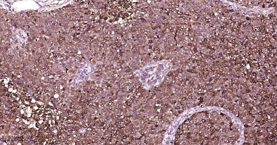 Paraformaldehyde-fixed, paraffin embedded Human Liver Cancer; Antigen retrieval by boiling in sodium citrate buffer (pH6.0) for 15 min; Antibody incubation Ferritin Heavy Chain Monoclonal Antibody, Unconjugated (bsm-54108R) at 1:200 overnight at 4°C, followed by conjugation to the bs-0295G-HRP and DAB (C-0010) staining.