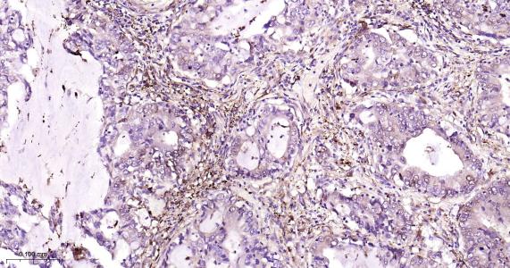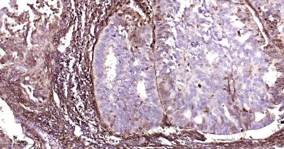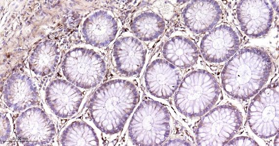 Paraformaldehyde-fixed, paraffin embedded Human Colon; Antigen retrieval by boiling in sodium citrate buffer (pH6.0) for 15 min; Antibody incubation Ferritin Heavy Chain Monoclonal Antibody, Unconjugated (bsm-54108R) at 1:200 overnight at 4°C, followed by conjugation to the bs-0295G-HRP and DAB (C-0010) staining.