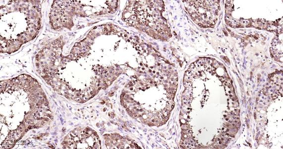 Paraformaldehyde-fixed, paraffin embedded Human Testicles; Antigen retrieval by boiling in sodium citrate buffer (pH6.0) for 15 min; Antibody incubation Ferritin Heavy Chain Monoclonal Antibody, Unconjugated (bsm-54108R) at 1:200 overnight at 4°C, followed by conjugation to the bs-0295G-HRP and DAB (C-0010) staining.