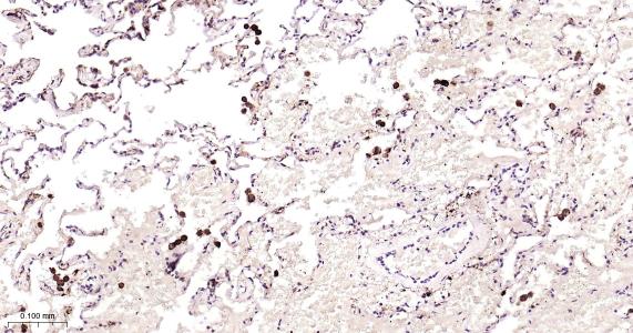 Paraformaldehyde-fixed, paraffin embedded Human Lung; Antigen retrieval by boiling in sodium citrate buffer (pH6.0) for 15 min; Antibody incubation Ferritin Heavy Chain Monoclonal Antibody, Unconjugated (bsm-54108R) at 1:200 overnight at 4°C, followed by conjugation to the bs-0295G-HRP and DAB (C-0010) staining.