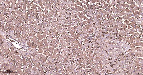 Paraformaldehyde-fixed, paraffin embedded Human Liver; Antigen retrieval by boiling in sodium citrate buffer (pH6.0) for 15 min; Antibody incubation Ferritin Heavy Chain Monoclonal Antibody, Unconjugated (bsm-54108R) at 1:200 overnight at 4°C, followed by conjugation to the bs-0295G-HRP and DAB (C-0010) staining.