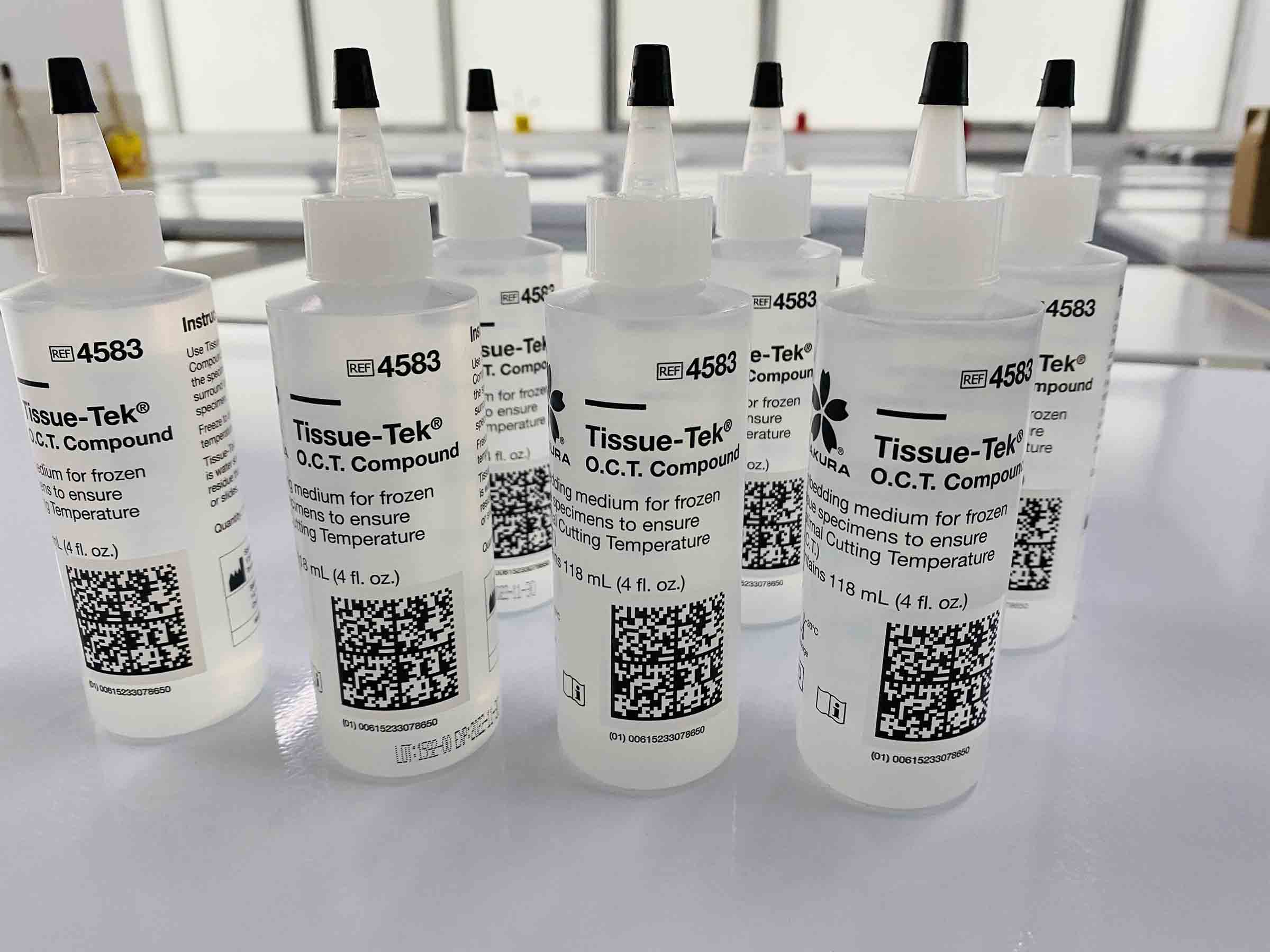 OCT冰凍切片包埋劑是一種聚乙二醇和聚乙烯醇的水溶性混合物,目前已廣泛用于免疫組化實(shí)驗(yàn)室中,其用途是在冰凍切片時(shí)支撐組織,以增加組織的連續(xù)性,減少皺折及碎裂。又因OCT混合物為水溶性,故在漂片時(shí)可溶于水,所以在以后的染色中不會(huì)增加背景染色。 利用OCT混合物(opti-mum cutting temperature compound)預(yù)先浸潤組織,然后再進(jìn)行恒冷箱切片,使切片質(zhì)量得到改善。 OCT包埋劑(SAKURA產(chǎn)品,MADE IN USA)包埋流程: 1. 將放在蔗糖溶液中的組織塊取出,放入20g L-1 蔗糖與OCT包埋劑1:1體積比例混合液中,室溫浸泡2h。 2. 移入OCT包埋劑中室溫浸泡4h,更換新的OCT包埋劑,室溫浸泡6h。 3. 將標(biāo)本置于托物臺(tái),用恒冷箱切片機(jī)切片(一般-22℃),片厚10μm,貼于預(yù)處理的載玻片上,-20℃冰箱保存。 |