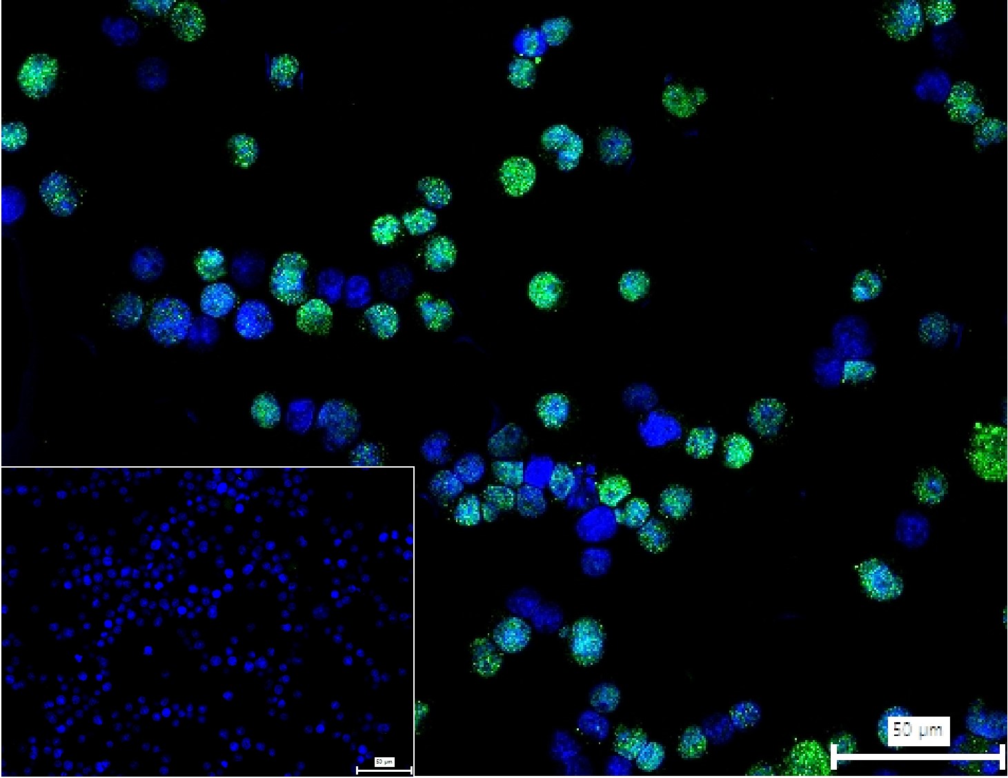 4% Paraformaldehyde-fixed Jurkat (H) cell; Triton X-100 at r.t. for 20 min; Antibody incubation with (ERG) monoclonal Antibody, unconjugated (bsm-52324R) 1:100, 90 min at 37°C; followed by conjugated Goat Anti-Rabbit IgG antibody (green, bs-60295G-BF488) at 37°C for 90 min, DAPI (blue, C02-04002) was used to stain the cell nuclei. PBS instead of the primary antibody was used as the blank control.