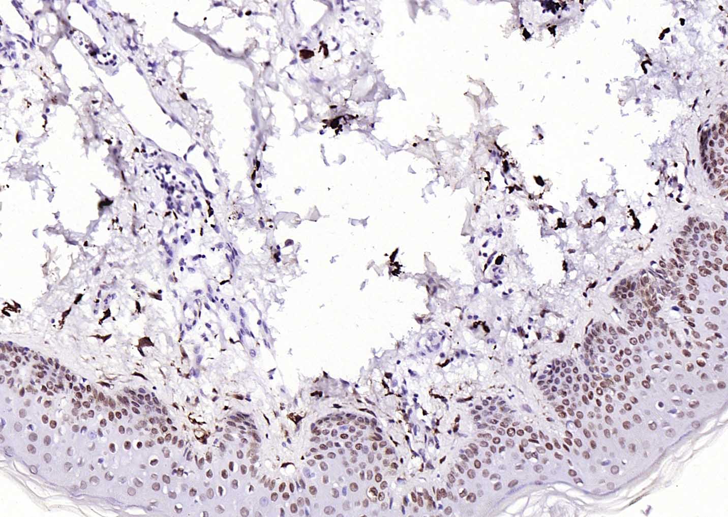 Paraformaldehyde-fixed, paraffin embedded (human skin cancer); Antigen retrieval by boiling in sodium citrate buffer (pH6.0) for 15min; Block endogenous peroxidase by 3% hydrogen peroxide for 20 minutes; Blocking buffer (normal goat serum) at 37°C for 30min; Antibody incubation with (H2AFX) Monoclonal Antibody, Unconjugated (bsm-51222M) at 1:200 overnight at 4°C, followed by operating according to SP Kit(Mouse)(sp-0024) instructionsand DAB staining.