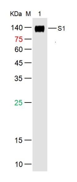 Lane 1: SARS-CoV-2 S1 Protein (His-Avi,HEK293) at 500ng