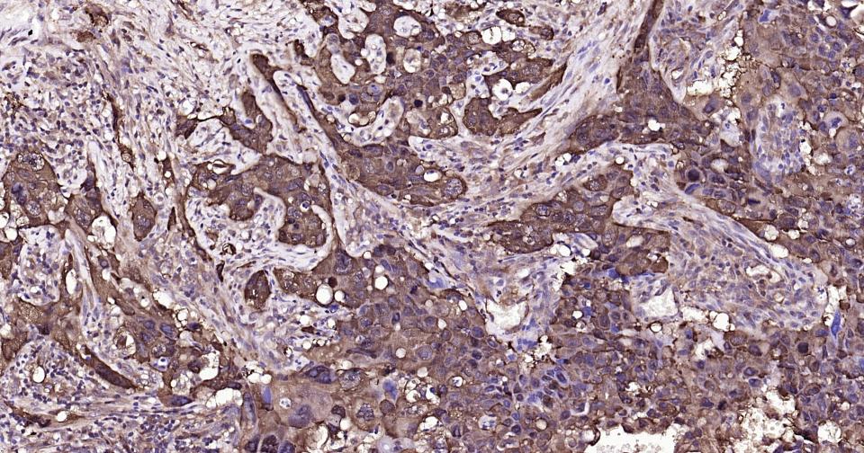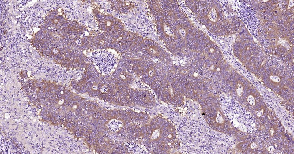 Paraformaldehyde-fixed, paraffin embedded Human Colon Cancer; Antigen retrieval by boiling in sodium citrate buffer (pH6.0) for 15 min; Antibody incubation with Hsp90 alpha Monoclonal Antibody, Unconjugated(bsm-52353R) at 1:200 overnight at 4°C, followed by conjugation to the SP Kit (Rabbit, SP-0023) and DAB (C-0010) staining.