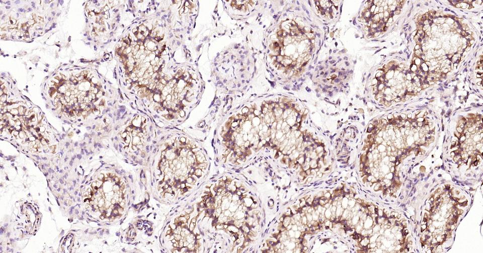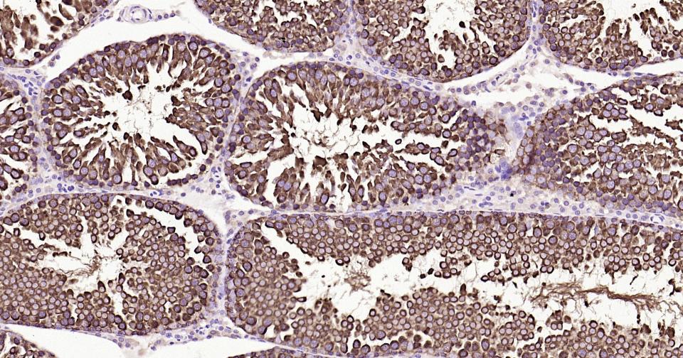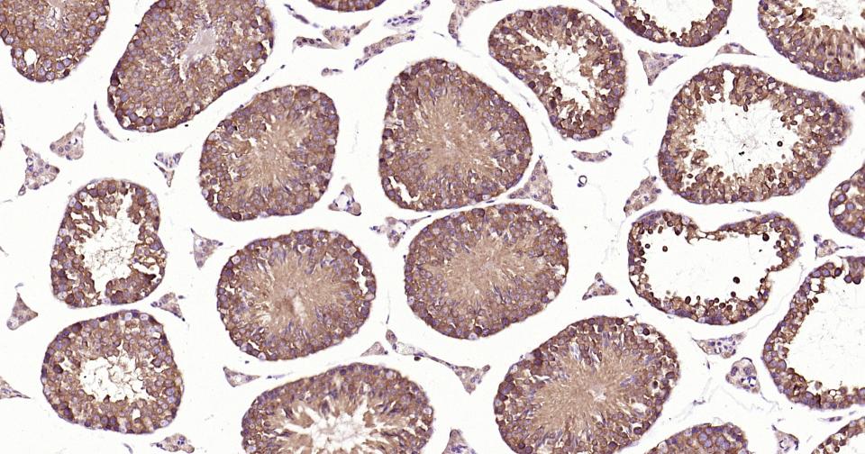 Paraformaldehyde-fixed, paraffin embedded Rat Testicles; Antigen retrieval by boiling in sodium citrate buffer (pH6.0) for 15 min; Antibody incubation with Hsp90 alpha Monoclonal Antibody, Unconjugated(bsm-52353R) at 1:200 overnight at 4°C, followed by conjugation to the SP Kit (Rabbit, SP-0023) and DAB (C-0010) staining.