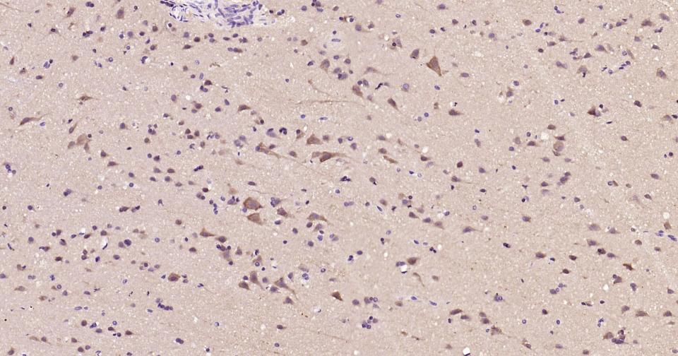 Paraformaldehyde-fixed, paraffin embedded Rat Cerebrum; Antigen retrieval by boiling in sodium citrate buffer (pH6.0) for 15 min; Antibody incubation with Hsp90 alpha Monoclonal Antibody, Unconjugated(bsm-52353R) at 1:200 overnight at 4°C, followed by conjugation to the SP Kit (Rabbit, SP-0023) and DAB (C-0010) staining.