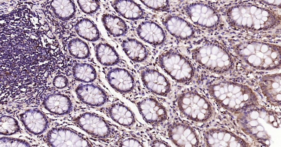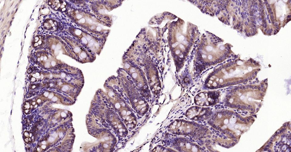 Paraformaldehyde-fixed, paraffin embedded Mouse Colon; Antigen retrieval by boiling in sodium citrate buffer (pH6.0) for 15 min; Antibody incubation with Hsp90 alpha Monoclonal Antibody, Unconjugated(bsm-52353R) at 1:200 overnight at 4°C, followed by conjugation to the SP Kit (Rabbit, SP-0023) and DAB (C-0010) staining.