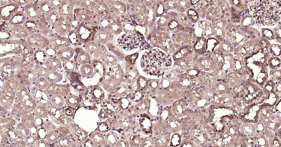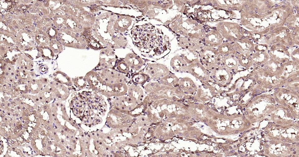 Paraformaldehyde-fixed, paraffin embedded Rat Kidney; Antigen retrieval by boiling in sodium citrate buffer (pH6.0) for 15 min; Antibody incubation with Hsp90 alpha Monoclonal Antibody, Unconjugated(bsm-52353R) at 1:200 overnight at 4°C, followed by conjugation to the SP Kit (Rabbit, SP-0023) and DAB (C-0010) staining.