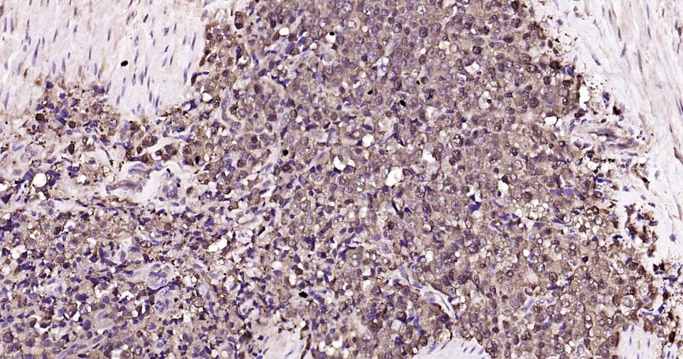 Paraformaldehyde-fixed, paraffin embedded Human Prostate Tumor; Antigen retrieval by boiling in sodium citrate buffer (pH6.0) for 15 min; Antibody incubation with Hsp90 alpha Monoclonal Antibody, Unconjugated(bsm-52353R) at 1:200 overnight at 4°C, followed by conjugation to the SP Kit (Rabbit, SP-0023) and DAB (C-0010) staining