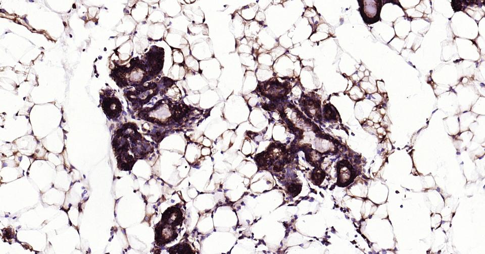 Paraformaldehyde-fixed, paraffin embedded Mouse Breast; Antigen retrieval by boiling in sodium citrate buffer (pH6.0) for 15 min; Antibody incubation with Hsp90 alpha Monoclonal Antibody, Unconjugated(bsm-52353R) at 1:200 overnight at 4°C, followed by conjugation to the SP Kit (Rabbit, SP-0023) and DAB (C-0010) staining.
