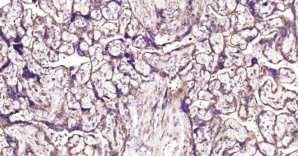 Paraformaldehyde-fixed, paraffin embedded Human Placenta; Antigen retrieval by boiling in sodium citrate buffer (pH6.0) for 15 min; Antibody incubation with ABCG2?Monoclonal Antibody, Unconjugated(bsm-52821R) at 1:200 overnight at 4°C, followed by conjugation to the bs-0295G-HRP and DAB (C-0010) staining.