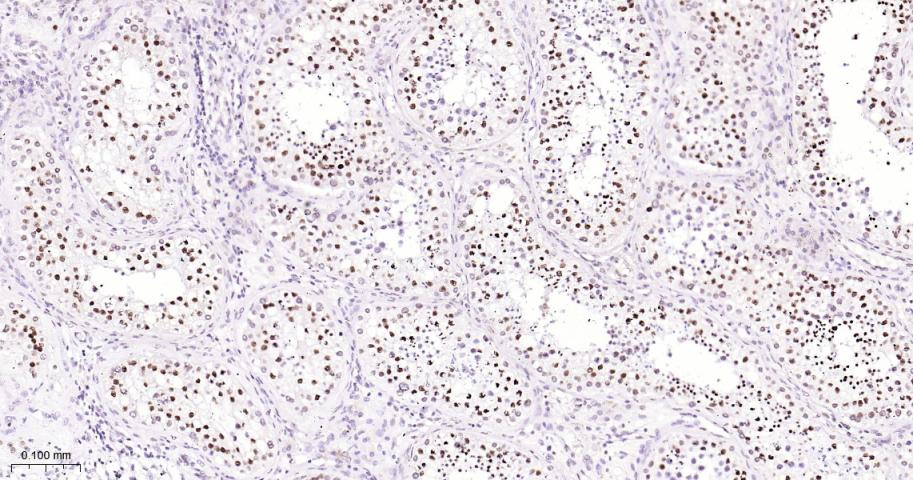 Paraformaldehyde-fixed, paraffin embedded Rat Testicles; Antigen retrieval by boiling in sodium citrate buffer (pH6.0) for 15 min; The section was incubated with Histone H3 (Tri Methyl K9) Polyclonal Antibody, Unconjugated (bs-53114R) at 1:200 overnight at 4°C, followed by conjugation to the bs-0295G-HRP and DAB (C-0010) staining.