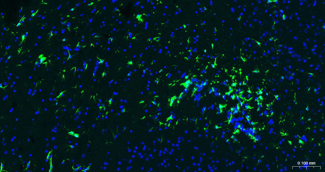 Paraformaldehyde-fixed, paraffin embedded Mouse Cerebrum; Antigen retrieval by boiling in sodium citrate buffer (pH6.0) for 15 min; Antibody incubation with Vimentin Monoclonal Antibody, Unconjugated (bsm-42001R) at 1:200 overnight at 4°C. Followed by conjugated Goat Anti-Rabbit IgG antibody (green, bs-60295G-FITC), DAPI (blue, C02-04002) was used to stain the cell nuclei.