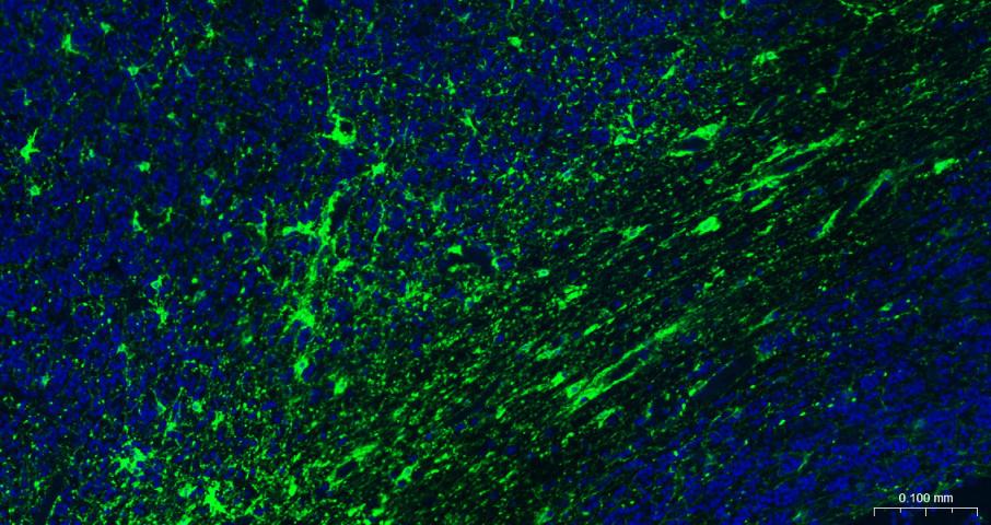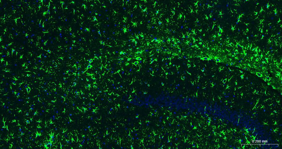 Paraformaldehyde-fixed, paraffin embedded Rat Cerebrum; Antigen retrieval by boiling in sodium citrate buffer (pH6.0) for 15 min; Antibody incubation with Vimentin Monoclonal Antibody, Unconjugated (bsm-42001R) at 1:200 overnight at 4°C. Followed by conjugated Goat Anti-Rabbit IgG antibody (green, bs-60295G-FITC), DAPI (blue, C02-04002) was used to stain the cell nuclei.