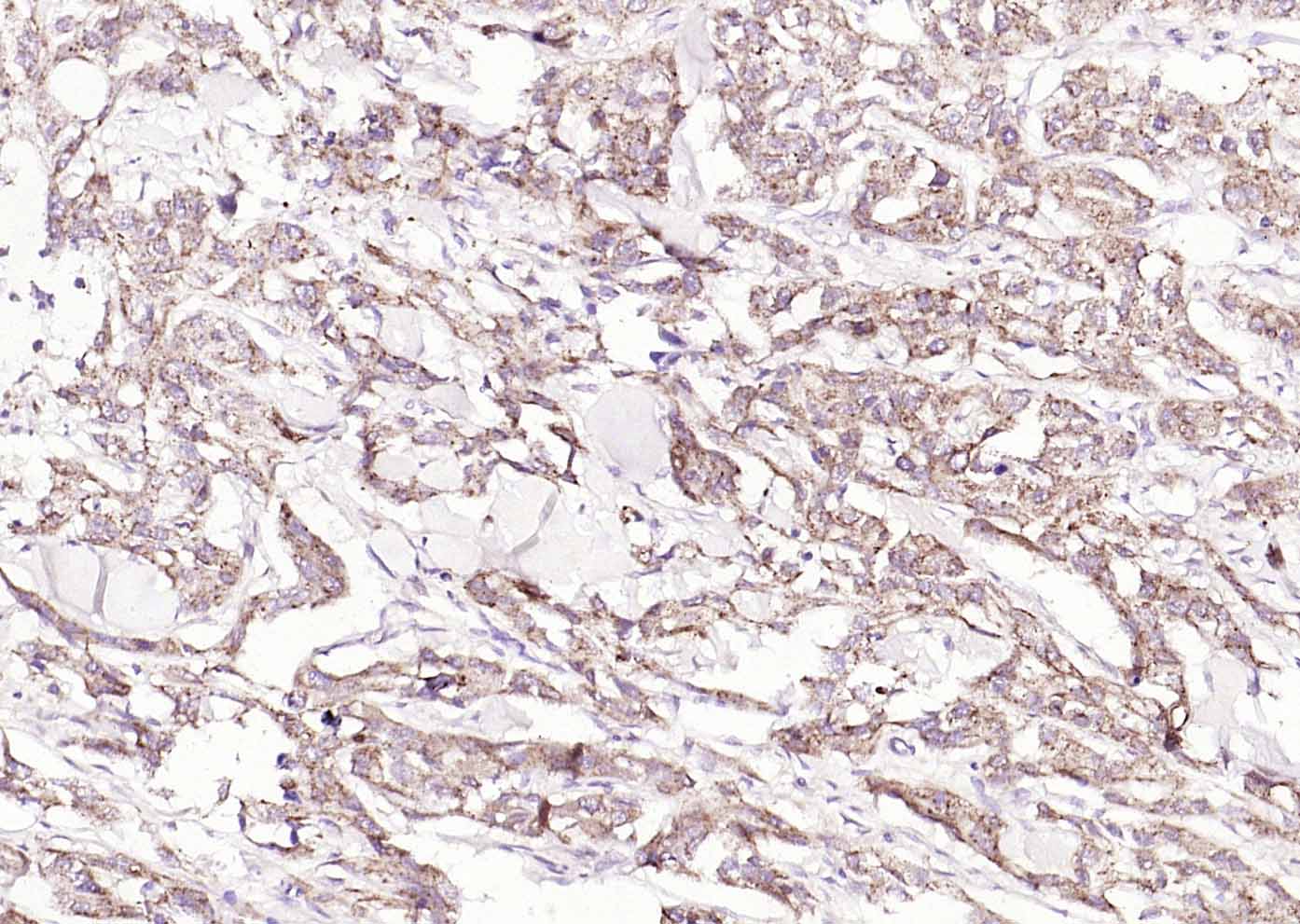 Paraformaldehyde-fixed, paraffin embedded (human skin cancer); Antigen retrieval by boiling in sodium citrate buffer (pH6.0) for 15min; Block endogenous peroxidase by 3% hydrogen peroxide for 20 minutes; Blocking buffer (normal goat serum) at 37°C for 30min; Incubation with (SPARC ) Polyclonal Antibody, Unconjugated (bs-25112R) at 1:200 overnight at 4°C, followed by operating according to SP Kit(Rabbit) (sp-0023) instructionsand DAB staining.