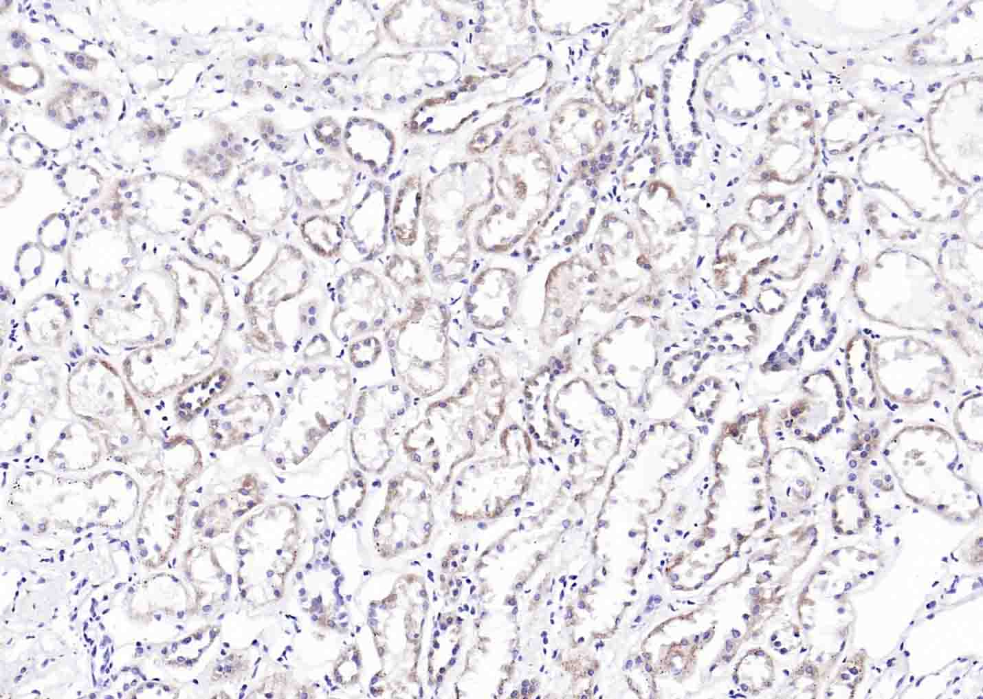 Paraformaldehyde-fixed, paraffin embedded (Human kidney); Antigen retrieval by boiling in sodium citrate buffer (pH6.0) for 15min; Block endogenous peroxidase by 3% hydrogen peroxide for 20 minutes; Blocking buffer (normal goat serum) at 37°C for 30min; Antibody incubation with (phospho-LRP5 (Thr1492)) Polyclonal Antibody, Unconjugated (bs-25114R) at 1:200 overnight at 4°C, followed by operating according to SP Kit(Rabbit) (sp-0023) instructionsand DAB staining.