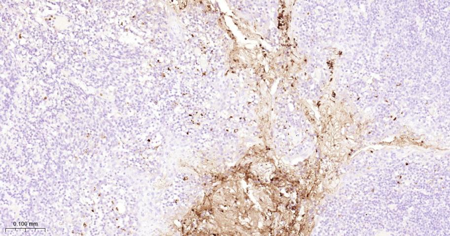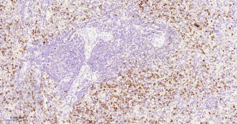 Paraformaldehyde-fixed, paraffin embedded Human Spleen; Antigen retrieval by boiling in sodium citrate buffer (pH6.0) for 15 min; The section was incubated with Azurocidin/HBP Monoclonal Antibody, Unconjugated (bsm-41703M) at 1:200 overnight at 4°C, followed by conjugation to the bs-40296G-HRP and DAB (C-0010) staining.