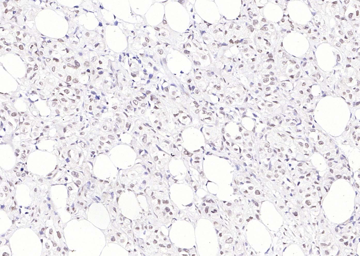Paraformaldehyde-fixed, paraffin embedded (human breast carcinoma); Antigen retrieval by boiling in sodium citrate buffer (pH6.0) for 15min; Block endogenous peroxidase by 3% hydrogen peroxide for 20 minutes; Blocking buffer (normal goat serum) at 37°C for 30min; Incubation with (Phospho-PIN1(Ser16) ) Polyclonal Antibody, Unconjugated (bs-25158R) at 1:200 overnight at 4°C, followed by operating according to SP Kit(Rabbit) (sp-0023) instructionsand DAB staining.