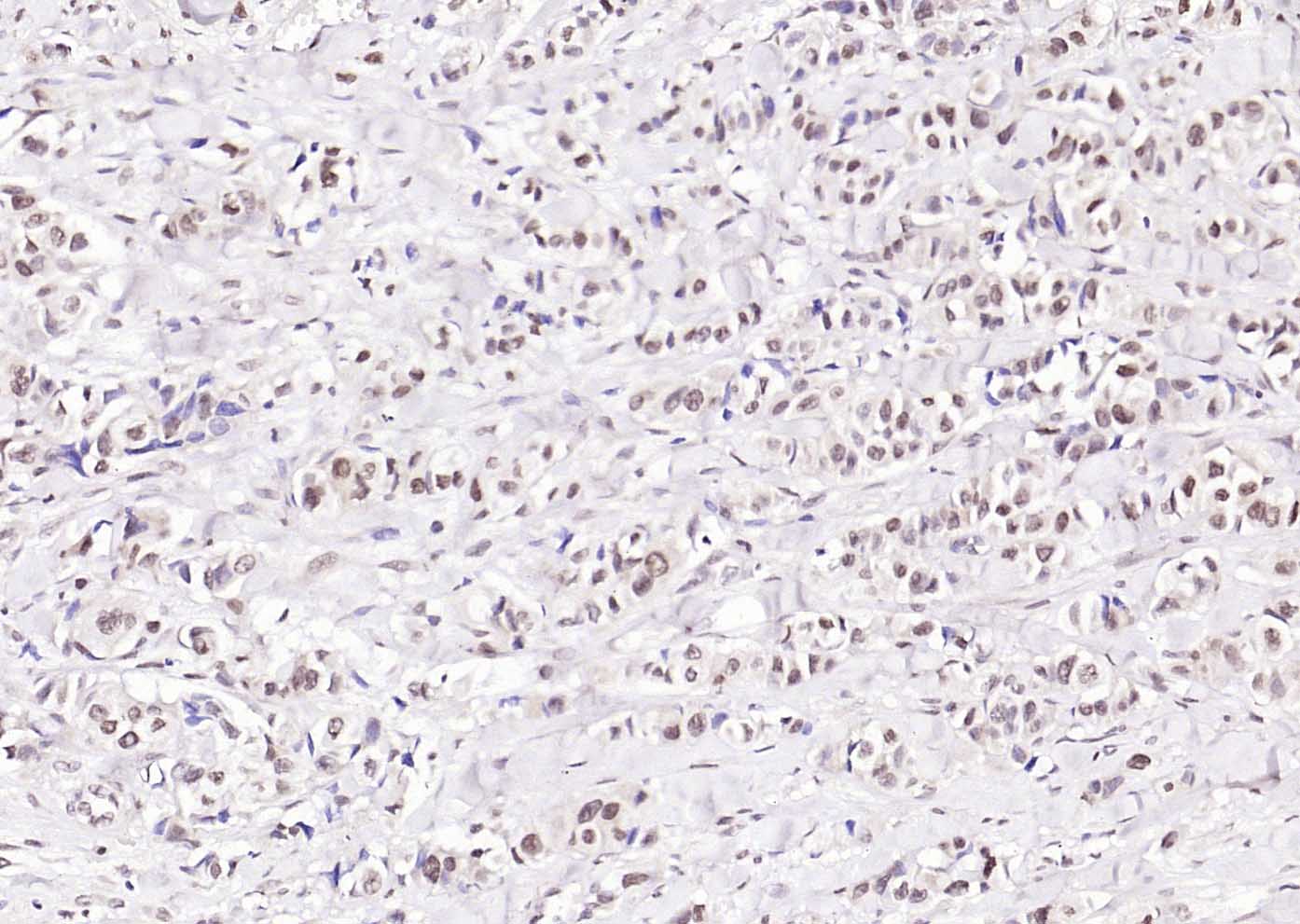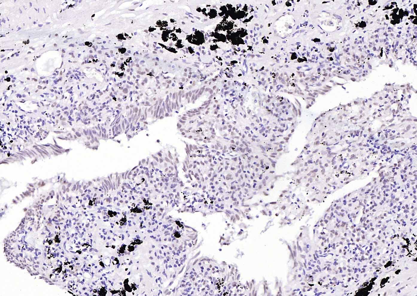 Paraformaldehyde-fixed, paraffin embedded (human lung carcinoma); Antigen retrieval by boiling in sodium citrate buffer (pH6.0) for 15min; Block endogenous peroxidase by 3% hydrogen peroxide for 20 minutes; Blocking buffer (normal goat serum) at 37°C for 30min; Incubation with (Phospho-PIN1(Ser71) ) Polyclonal Antibody, Unconjugated (bs-25159R) at 1:200 overnight at 4°C, followed by operating according to SP Kit(Rabbit) (sp-0023) instructionsand DAB staining.