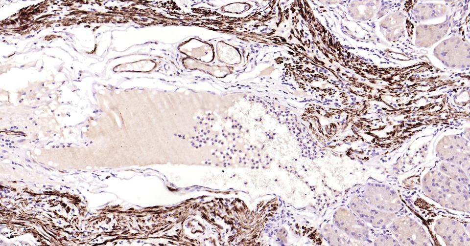 Paraformaldehyde-fixed, paraffin embedded Rat Stomach; Antigen retrieval by boiling in sodium citrate buffer (pH6.0) for 15 min; Antibody incubation with Desmin Monoclonal Antibody, Unconjugated(bsm-60266R) at 1:200 overnight at 4°C, followed by conjugation to the bs-0295G-HRP and DAB (C-0010) staining.