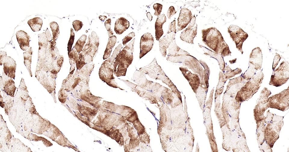 Paraformaldehyde-fixed, paraffin embedded Mouse Skeletal muscle; Antigen retrieval by boiling in sodium citrate buffer (pH6.0) for 15 min; Antibody incubation with Desmin Monoclonal Antibody, Unconjugated(bsm-60266R) at 1:200 overnight at 4°C, followed by conjugation to the bs-0295G-HRP and DAB (C-0010) staining.