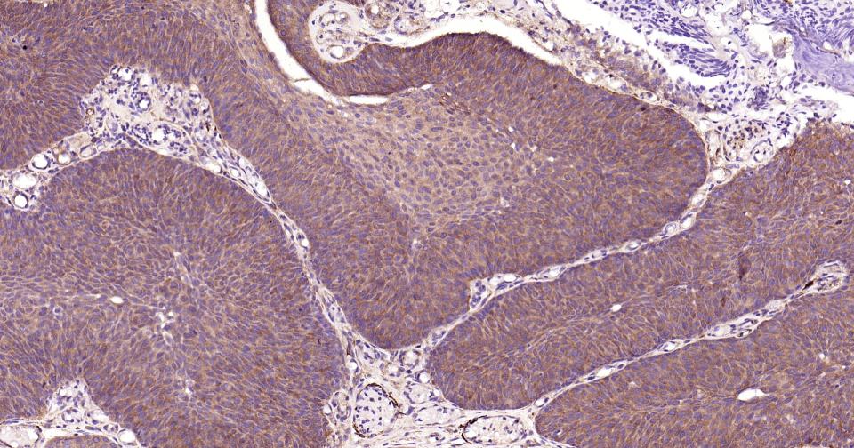 Paraformaldehyde-fixed, paraffin embedded Human Esophageal Cancer; Antigen retrieval by boiling in sodium citrate buffer (pH6.0) for 15 min; Antibody incubation with Desmin Monoclonal Antibody, Unconjugated(bsm-60266R) at 1:200 overnight at 4°C, followed by conjugation to the bs-0295G-HRP and DAB (C-0010) staining.