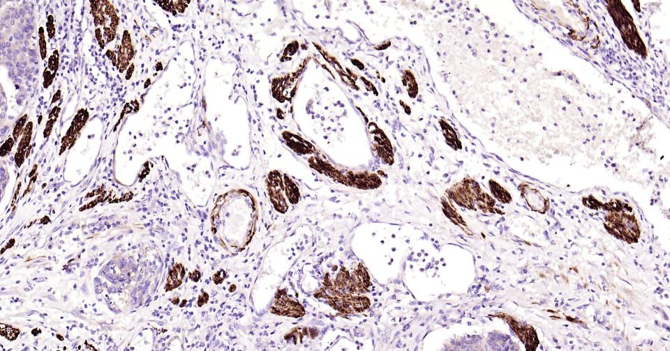 Paraformaldehyde-fixed, paraffin embedded Human Prostate Tumor; Antigen retrieval by boiling in sodium citrate buffer (pH6.0) for 15 min; Antibody incubation with Desmin Monoclonal Antibody, Unconjugated(bsm-60266R) at 1:200 overnight at 4°C, followed by conjugation to the bs-0295G-HRP and DAB (C-0010) staining.