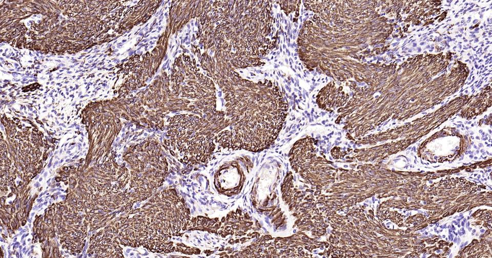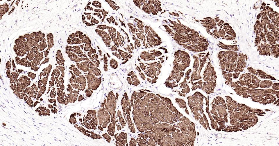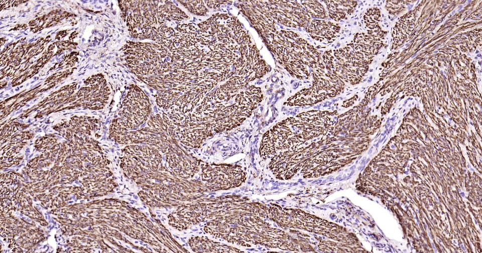 Paraformaldehyde-fixed, paraffin embedded Human Uterus; Antigen retrieval by boiling in sodium citrate buffer (pH6.0) for 15 min; Antibody incubation with Desmin Monoclonal Antibody, Unconjugated(bsm-60266R) at 1:200 overnight at 4°C, followed by conjugation to the bs-0295G-HRP and DAB (C-0010) staining.