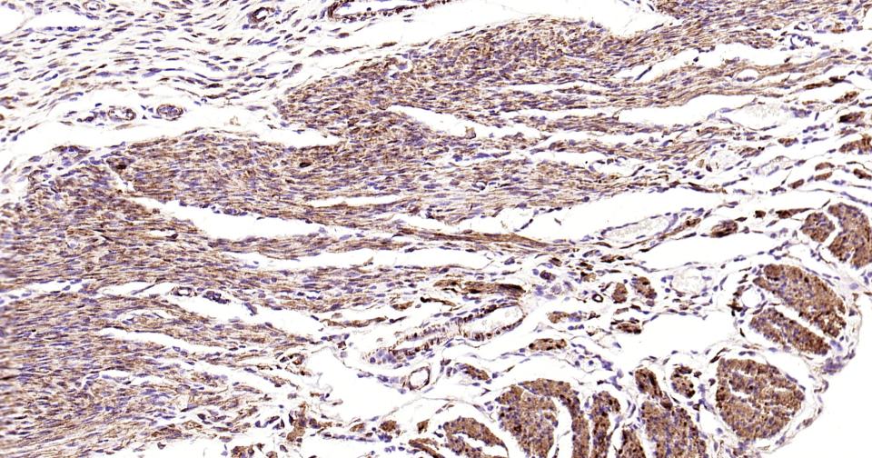 Paraformaldehyde-fixed, paraffin embedded Rat Uterus; Antigen retrieval by boiling in sodium citrate buffer (pH6.0) for 15 min; Antibody incubation with Desmin Monoclonal Antibody, Unconjugated(bsm-60266R) at 1:200 overnight at 4°C, followed by conjugation to the bs-0295G-HRP and DAB (C-0010) staining.