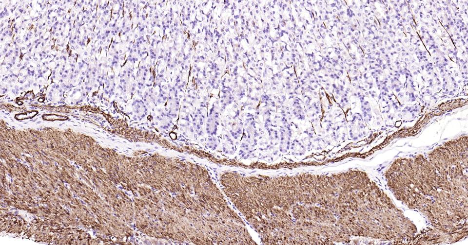 Paraformaldehyde-fixed, paraffin embedded Mouse Stomach; Antigen retrieval by boiling in sodium citrate buffer (pH6.0) for 15 min; Antibody incubation with Desmin Monoclonal Antibody, Unconjugated(bsm-60266R) at 1:200 overnight at 4°C, followed by conjugation to the bs-0295G-HRP and DAB (C-0010) staining.