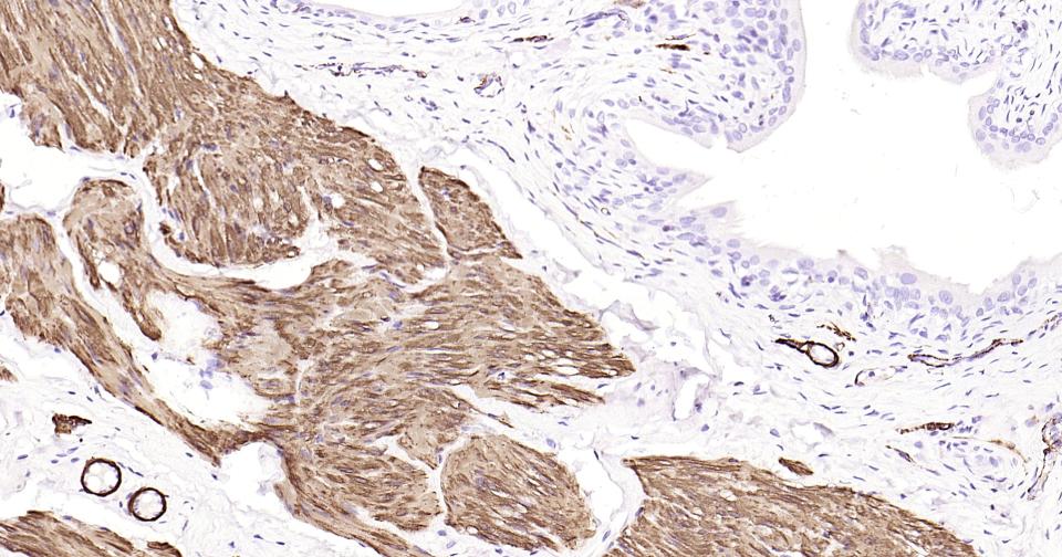 Paraformaldehyde-fixed, paraffin embedded Mouse Bladder; Antigen retrieval by boiling in sodium citrate buffer (pH6.0) for 15 min; Antibody incubation with Desmin Monoclonal Antibody, Unconjugated(bsm-60266R) at 1:200 overnight at 4°C, followed by conjugation to the bs-0295G-HRP and DAB (C-0010) staining.