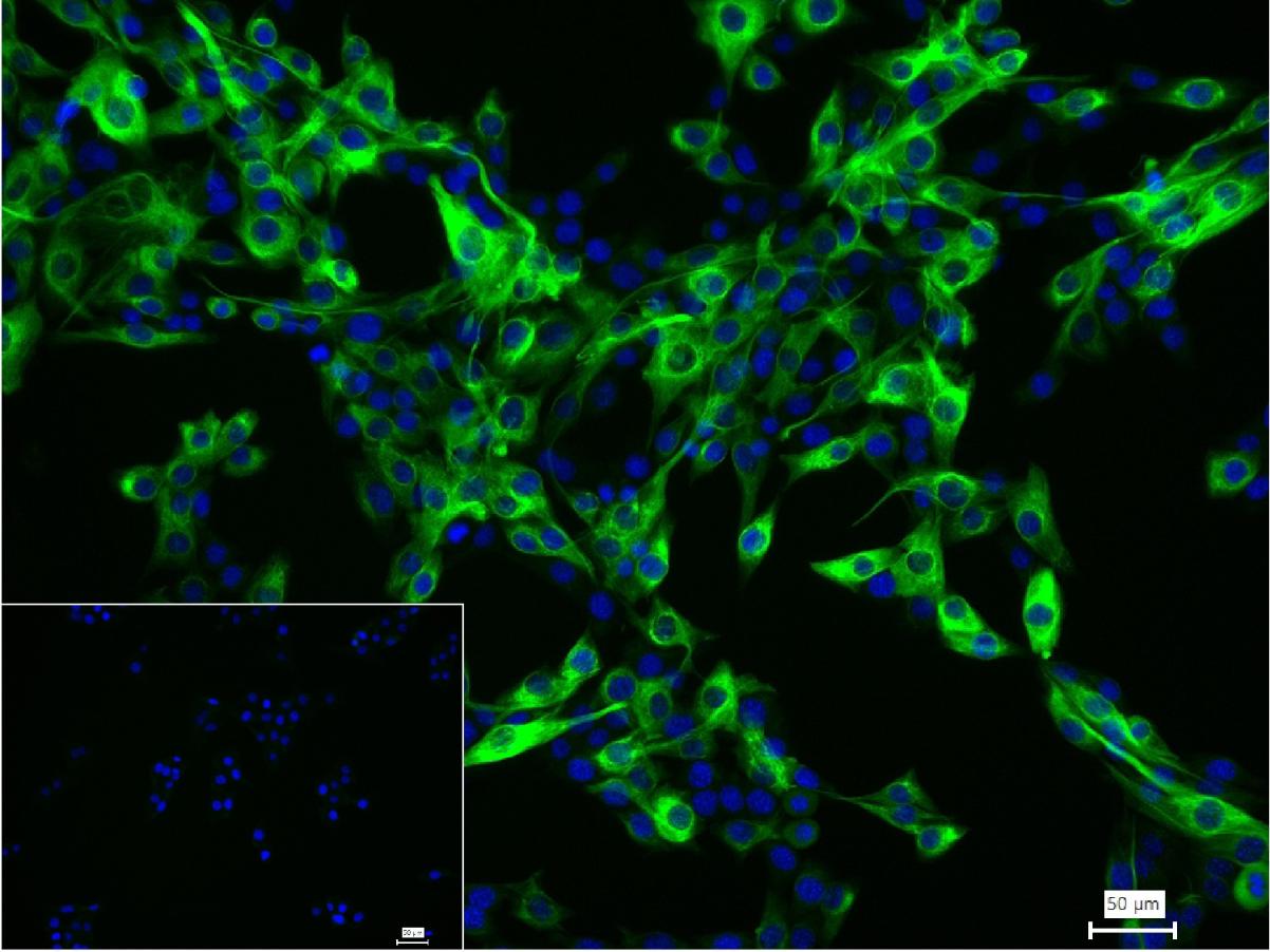 4% Paraformaldehyde-fixed C2C12 (M) cell; Triton X-100 at r.t. for 20 min; Antibody incubation with (Desmin) monoclonal Antibody, unconjugated (bsm-60266R) 1:100, 90 min at 37°C; followed by conjugated Goat Anti-Rabbit IgG antibody (green, bs-40295G-FITC) at 37°C for 90 min, DAPI (blue, C02-04002) was used to stain the cell nuclei. PBS instead of the primary antibody was used as the blank control.