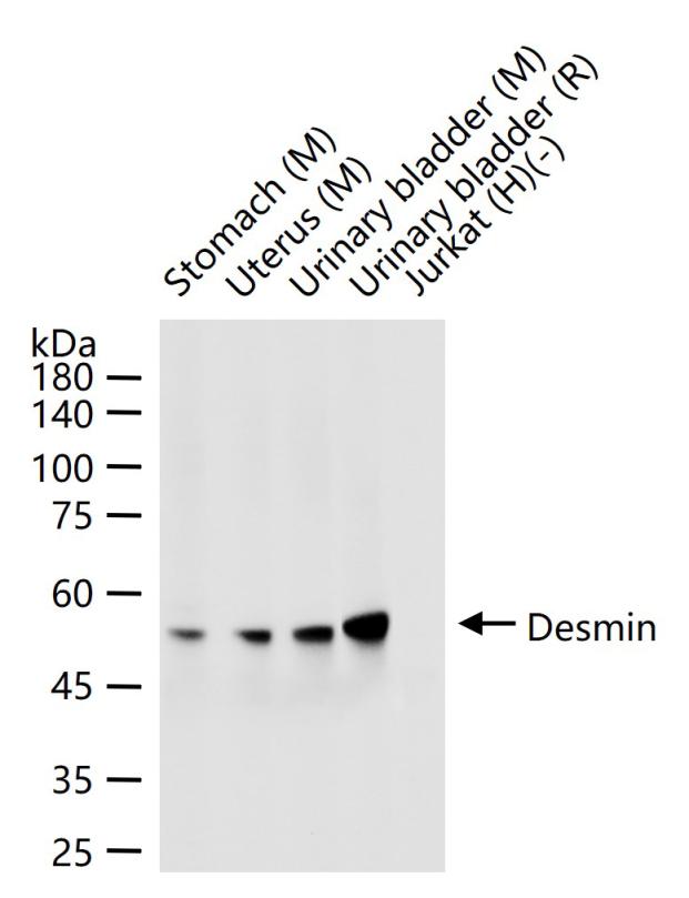 25 ug total protein per lane of various lysates (see on figure) probed with Desmin monoclonal antibody, unconjugated (bsm-60266R) at 1:5000 dilution and 4°C overnight incubation. Followed by conjugated secondary antibody incubation at r.t. for 60 min.
