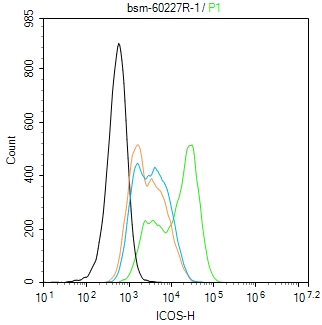 The HL-60(H) cells were incubated in 5%BSA to block non-specific protein-protein interactions (30 min at r.t.). Primary Antibody (green): Rabbit Anti-ICOS antibody (bsm-60227R): 1 μg/10^6 cells; Secondary Antibody (white blue): Goat anti-Rabbit IgG-FITC (bs-60295G-FITC): 1 μg/test. Isotype Control (orange): Rabbit IgG (bs-0295P). Blank control (black): PBS. Acquisition of 20,000 events was performed.