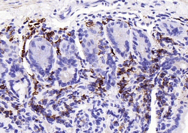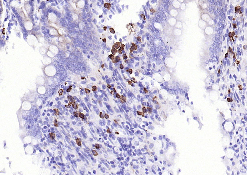 Paraformaldehyde-fixed, paraffin embedded (mouse colon); Antigen retrieval by boiling in sodium citrate buffer (pH6.0) for 15min; Block endogenous peroxidase by 3% hydrogen peroxide for 20 minutes; Blocking buffer (normal goat serum) at 37°C for 30min; Antibody incubation with (JCHAIN) Monoclonal Antibody, Unconjugated (bsm-60277R) at 1:200 overnight at 4°C, followed by operating according to SP Kit(Rabbit) (sp-0023) instructionsand DAB staining.