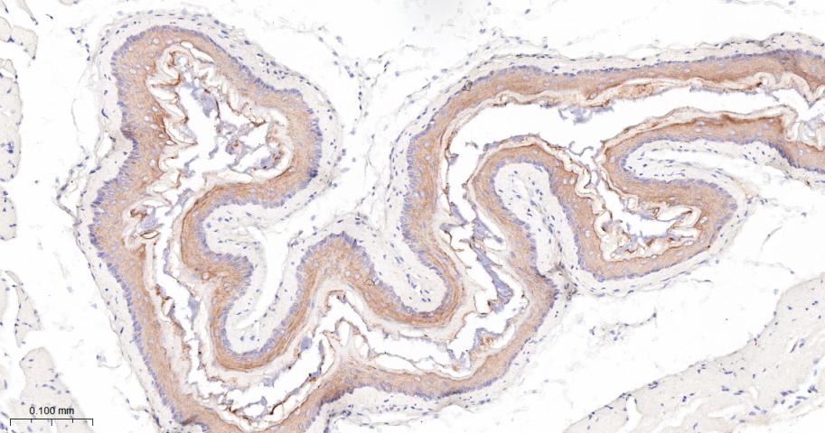 Paraformaldehyde-fixed, paraffin embedded Mouse Esophagus; Antigen retrieval by boiling in sodium citrate buffer (pH6.0) for 15 min; The section was incubated with Keratin 4 Monoclonal Antibody, Unconjugated (bsm-60219R) at 1:200 overnight at 4°C, followed by conjugation to the bs-0295G-HRP and DAB (C-0010) staining.