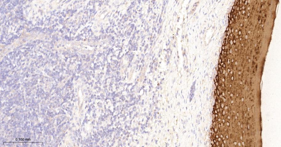 Paraformaldehyde-fixed, paraffin embedded Human Tonsil; Antigen retrieval by boiling in sodium citrate buffer (pH6.0) for 15 min; The section was incubated with Keratin 4 Monoclonal Antibody, Unconjugated (bsm-60219R) at 1:200 overnight at 4°C, followed by conjugation to the bs-0295G-HRP and DAB (C-0010) staining.