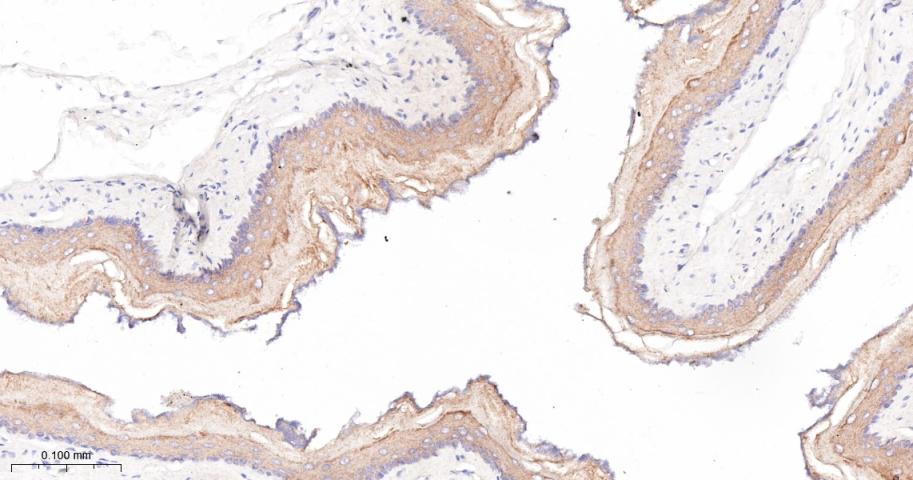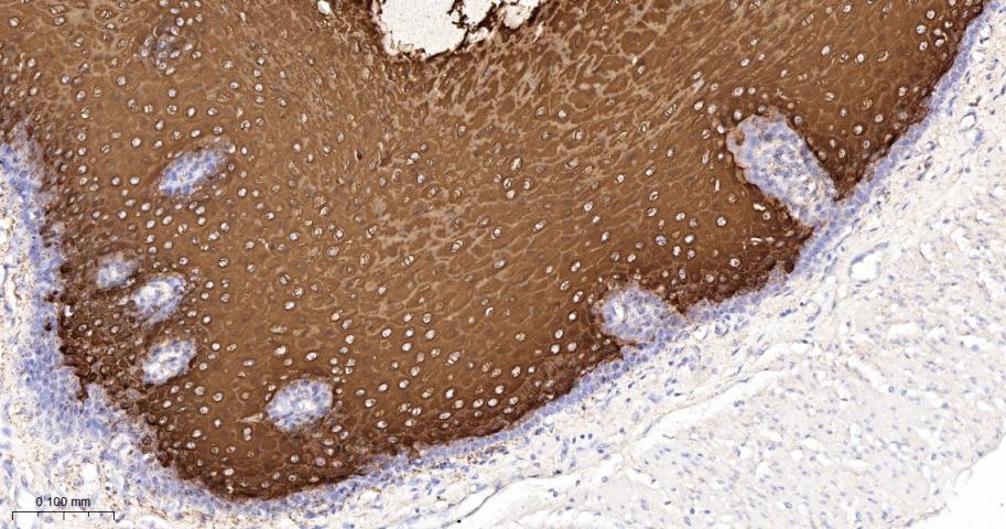 Paraformaldehyde-fixed, paraffin embedded Rat Esophagus; Antigen retrieval by boiling in sodium citrate buffer (pH6.0) for 15 min; The section was incubated with Keratin 4 Monoclonal Antibody, Unconjugated (bsm-60219R) at 1:200 overnight at 4°C, followed by conjugation to the bs-0295G-HRP and DAB (C-0010) staining.