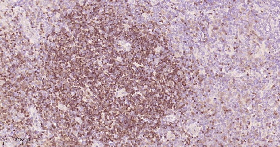 Paraformaldehyde-fixed, paraffin embedded Rat Spleen; Antigen retrieval by boiling in sodium citrate buffer (pH6.0) for 15 min; Antibody incubation with PAX5 Monoclonal Antibody, Unconjugated(bsm-60221R) at 1:100 overnight at 4°C, followed by conjugation to the bs-0295G-HRP and DAB (C-0010) staining.