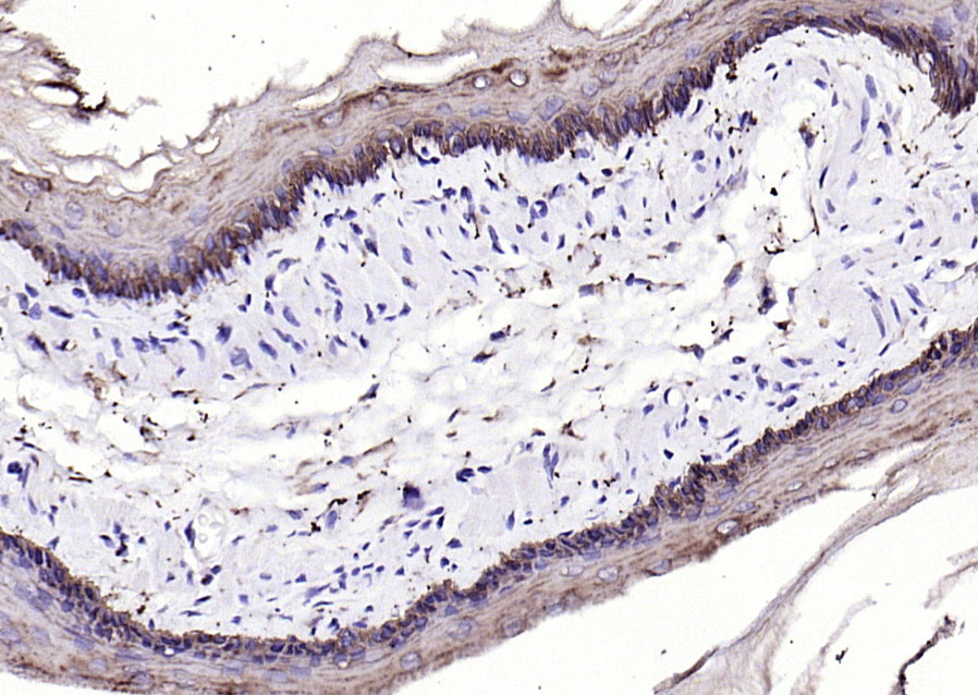 Paraformaldehyde-fixed, paraffin embedded (rat skin); Antigen retrieval by boiling in sodium citrate buffer (pH6.0) for 15min; Block endogenous peroxidase by 3% hydrogen peroxide for 20 minutes; Blocking buffer (normal goat serum) at 37°C for 30min; Antibody incubation with (Keratin 6) Monoclonal Antibody, Unconjugated (bsm-60235R) at 1:200 overnight at 4°C, followed by operating according to SP Kit(Rabbit) (sp-0023) instructionsand DAB staining.
