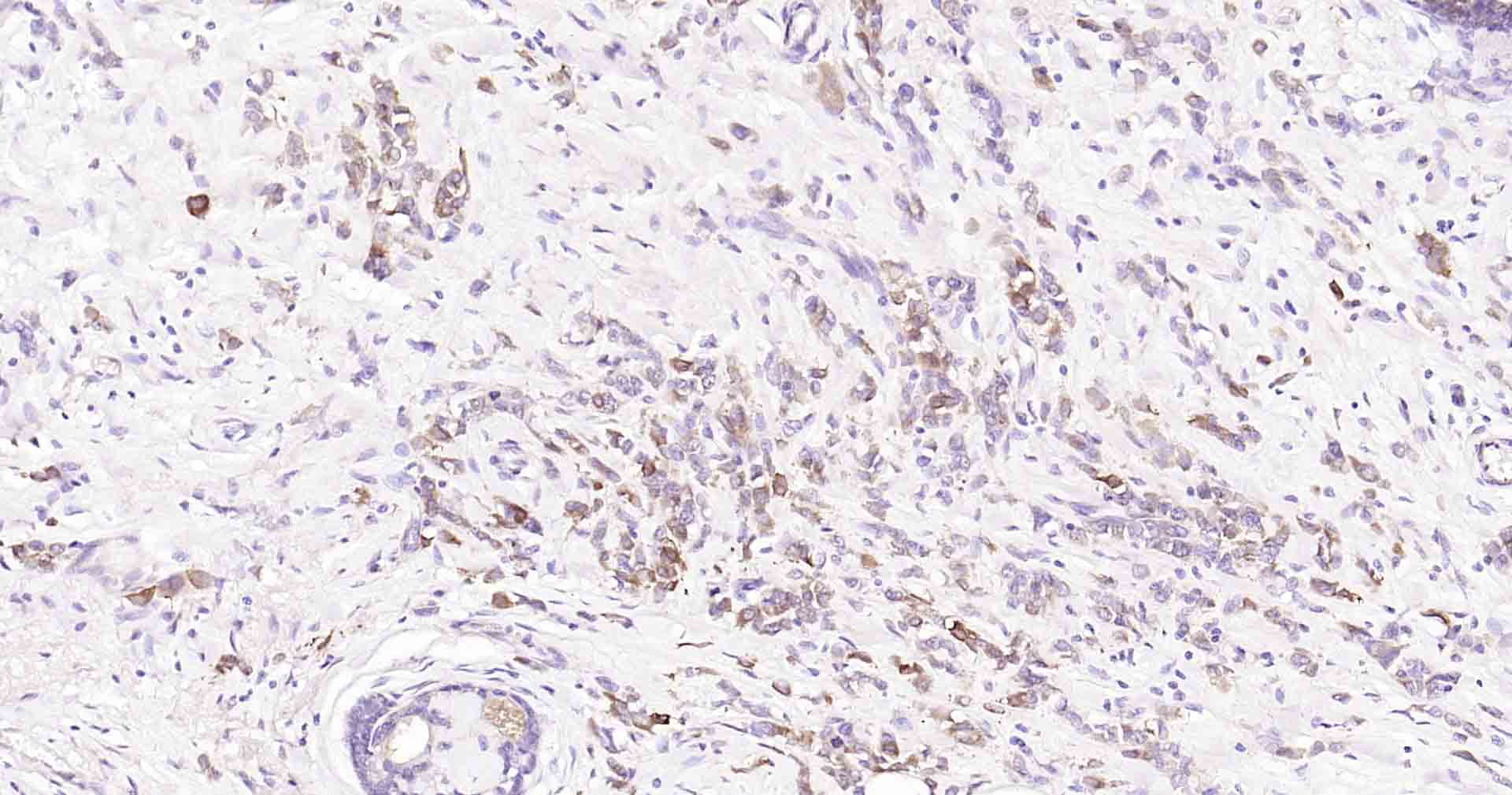 Paraformaldehyde-fixed, paraffin embedded Human Breast Cancer; Antigen retrieval by boiling in sodium citrate buffer (pH6.0) for 15 min; Antibody incubation with Human Tau-4 Monoclonal Antibody, Unconjugated(bsm-41722M) at 1:200 overnight at 4°C, followed by conjugation to the SP Kit (Mouse, sp-0024) and DAB (C-0010) staining.