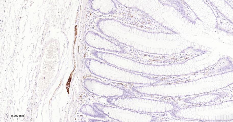 Paraformaldehyde-fixed, paraffin embedded Human Colon; Antigen retrieval by boiling in sodium citrate buffer (pH6.0) for 15 min; The section was incubated with Tau-4 Monoclonal Antibody, Unconjugated (ascites of bsm-41722M) at 1:1500 overnight at 4°C, followed by conjugation to the bs-40296G-HRP and DAB (C-0010) staining.