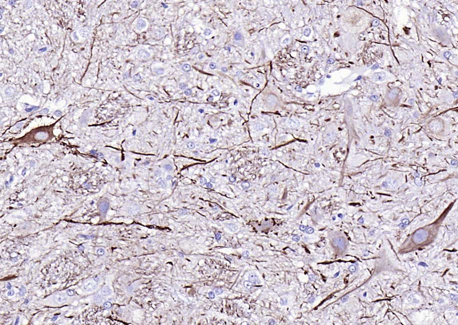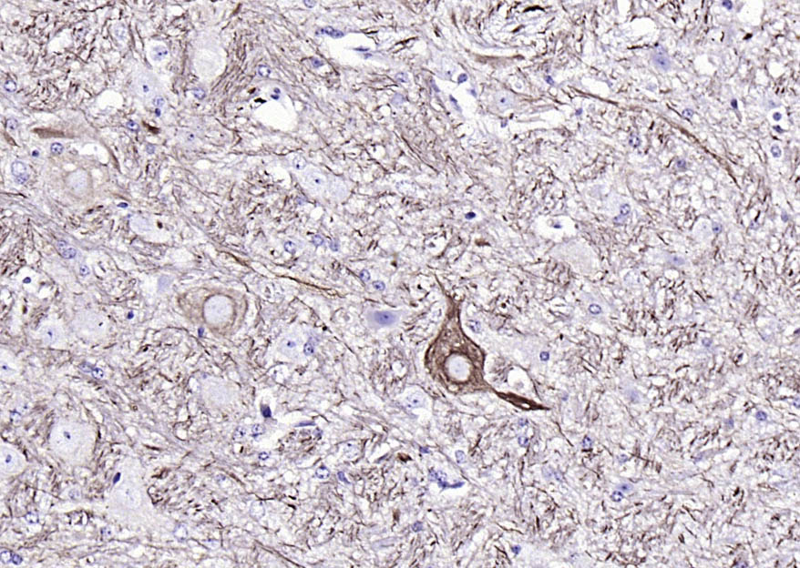 Paraformaldehyde-fixed, paraffin embedded (rat brain); Antigen retrieval by boiling in sodium citrate buffer (pH6.0) for 15min; Block endogenous peroxidase by 3% hydrogen peroxide for 20 minutes; Blocking buffer (normal goat serum) at 37°C for 30min; Antibody incubation with (NF-L) Monoclonal Antibody, Unconjugated (V5504) at 1:200 overnight at 4°C, followed by operating according to SP Kit(Mouse)(sp-0024) instructionsand DAB staining.