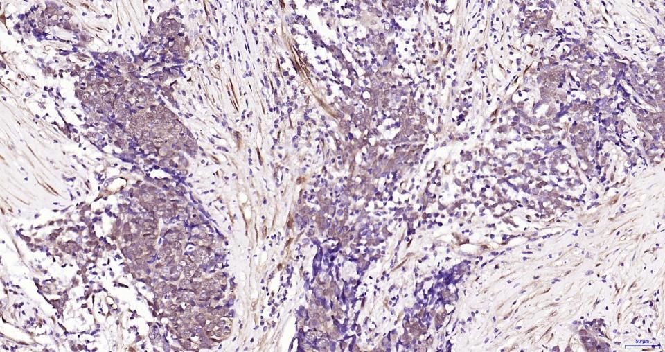Paraformaldehyde-fixed, paraffin embedded Human Breast; Antigen retrieval by boiling in sodium citrate buffer (pH6.0) for 15 min; Antibody incubation with phospho-ERK1 (Thr202)+ ERK2 (Thr185) Monoclonal Antibody, Unconjugated(bsm-54491R) at 1:200 overnight at 4°C, followed by conjugation to the SP Kit(Rabbit, SP-0023) and DAB (C-0010) staining.