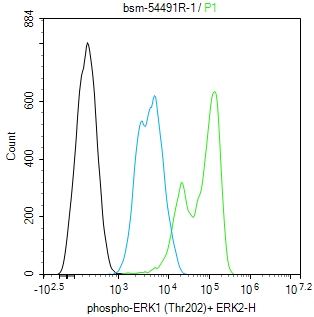 The Hela (treated with 200 ng/ml PMA for 30 minutes) (H) cells were fixed with 4% PFA (10 min at r.t.) and then permeabilized with 90% ice-cold methanol for 20 min at -20℃,the cells then were incubated in 5%BSA to block non-specific protein-protein interactions (30 min at r.t.).Primary Antibody (green):Rabbit Anti-phospho-ERK1 (Thr202)+ ERK2 (Thr185 antibody (bsm-54491R,1:100); Secondary Antibody (white blue): Goat anti-Rabbit IgG-BF488 (bs-60295G-BF488):1μg/test.Blank control (black): PBS. Acquisition of 20,000 events was performed.