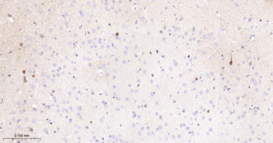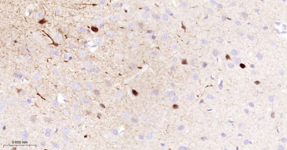 Paraformaldehyde-fixed, paraffin embedded Rat Cerebrum; Antigen retrieval by boiling in sodium citrate buffer (pH6.0) for 15 min; The section was incubated with phospho-ERK1 (Thr202)+ ERK2 (Thr185)?Monoclonal Antibody, Unconjugated (bsm-54491R) at 1:200 overnight at 4°C, followed by conjugation to the bs-0295G-HRP and DAB (C-0010) staining.