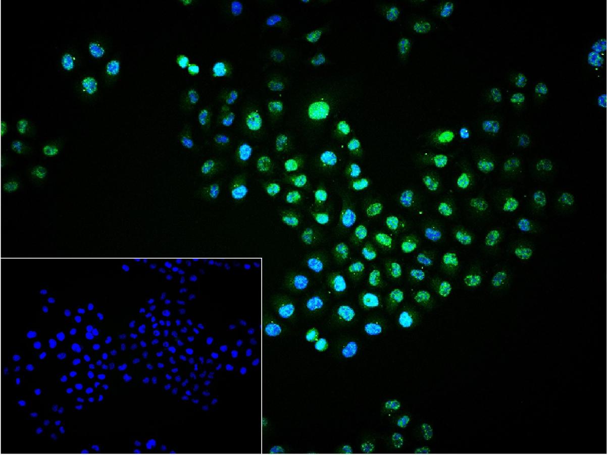 4% Paraformaldehyde-fixed Hela (treated with 200 ng/ml PMA for 30 minutes) (H) cell; Triton X-100 at r.t. for 20 min; Antibody incubation with (phospho-ERK1 (Thr202)+ ERK2 (Thr185)) monoclonal Antibody, unconjugated (bsm-54491R) 1:100, 90 min at 37°C; followed by conjugated Goat Anti-Rabbit IgG antibody (green, bs-60295G-BF488) at 37°C for 90 min, DAPI (blue, C02-04002) was used to stain the cell nuclei. PBS instead of the primary antibody was used as the blank control.